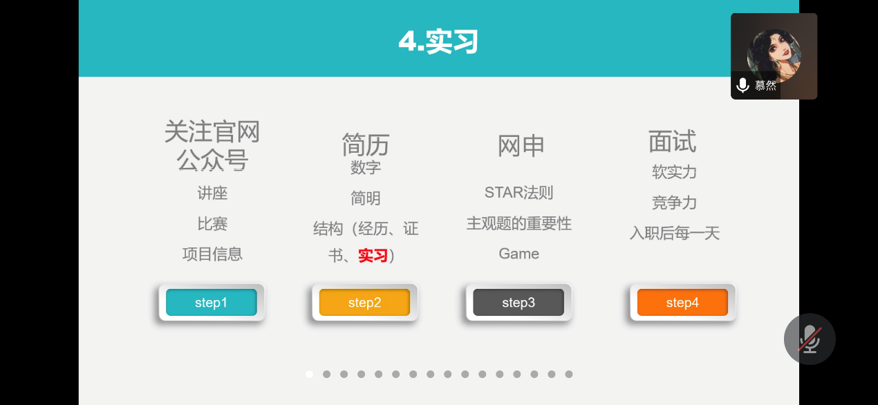 刘老师的精彩发言结束后,紧接着就是2018级刘佳雯师姐的经验分享。刘佳雯师姐成绩优异,获得了许多含金量高的证书。她不仅积极参加各类比赛、获得各种让人钦佩的奖项,与此同时还可以合理安排自己的学习时间,是我们学习的榜样。刘佳雯师姐的分享包括以下几个部分:学习规划、实践及科研、证书、实习。在学习规划方面,师姐告诉我们,大家对当下的规划可以不太细,但必须要有目标,要找到生活和学习之间的平衡。除了对当下要有规划,我们对自己的未来也要有一定的规划,思考未来的职场方向。在实践及科研方面,师姐用自己的亲身经历来告诉我们知识运用的重要性,指出参加科研项目时要注意的问题,并鼓励大家多参与学校举办的各种科研项目,如博文、大创等。在证书方面,师姐向我们介绍了大学可以考哪些证书,并将证书进行相应的分类,为大家厘清证书与专业的关系。在实习方面,师姐分享了获取实习资格的途径以及填写简历、申请职位时的技巧。